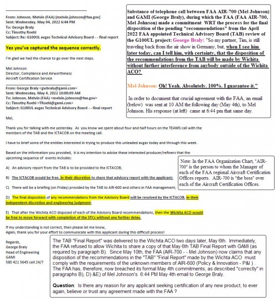This new "TAB" was started on April 1 and it was mandated to be concluded by May 1st. AIR-ONE (then Earl Lawrence - - he was "removed" shortly afterwards by FAA "leadership") advised George Braly in a phone call around March 27th (with Mel Johnson and Lance Gant on the call - - then AIR-300 and AIR-700, respectively) that the G100UL project would not be further delayed after the May 1st TAB report which was "only" concerned with "POLICY" and not concerned in any way with the validity of the compliance findings previously made the various FAA ACO's that had worked on the project.